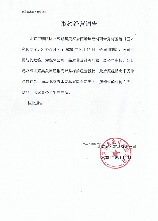 关于《北苑集美经销取缔》通告