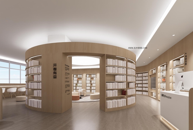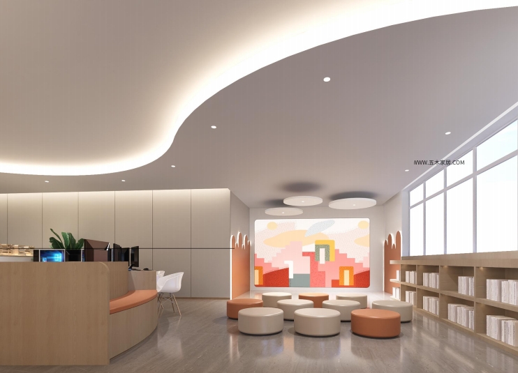 整个图书馆的颜色方案以白色和木质元素为主,营造出温馨、舒适、与自然亲近的氛围。墙壁采用白色,给人以宁静和宽广的感觉,而木质家具和地板则带来自然质感,与绿色植物相映成趣。